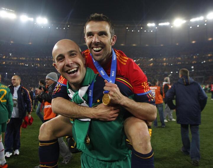 Pepe Reina (Aston Villa), Raul Albiol (Villarreal), Sergio Ramos (Real Madrid), Jesus Navas (Sevilla), Sergio Busquets (Barcelona), Javi Martinez (Bayern Munich), Andres Iniesta (Vissel Kobe), Juan Mata (Manchester United), Cesc Fabregas (Monaco), Pedro Rodríguez (Chelsea), David Silva (Manchester City) and Fernando Llorente (Napoli) have yet to hang up their boots.
