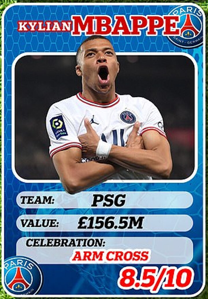 Age: 24 Club: PSG Value: £156.5m (Transfermarkt), Celebration: Arm Cross Rating: 8.5/10