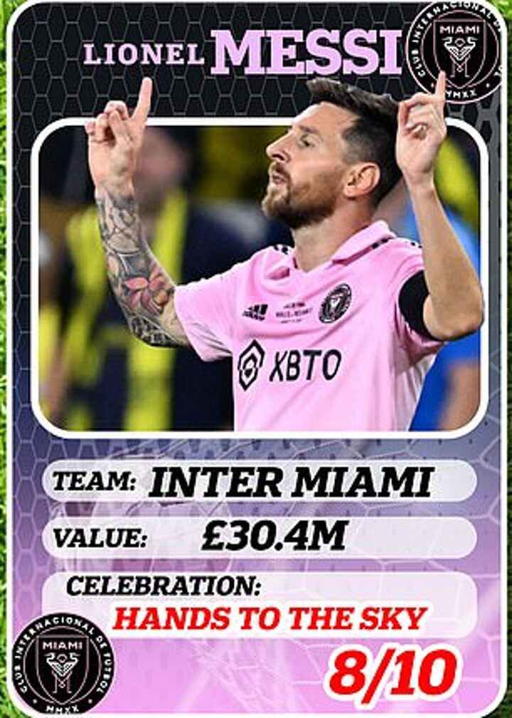 Age: 36 Club: Inter Miami Value: £30.4m (Transfermarkt), Celebration: Hands to the Sky Rating: 8/10