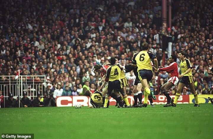Nigel Winterburn's crunching tackle on United full-back Dennis Irwin midway through the second half sparked a memorable brawl that ended up involving 21 players in total.