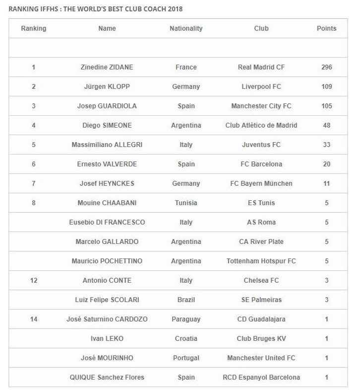 Jürgen Klopp and Josep Guardiola took place on the podium with excellent performances with their english teams .4 of the last Awards winners (Zidane, Guardiola, Simeone, Heynckes) took place in the World’s Top 7 !