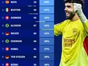 Clean sheet rates of UCL goalkeepers in the past decade: Raya 1st, Buffon 2nd