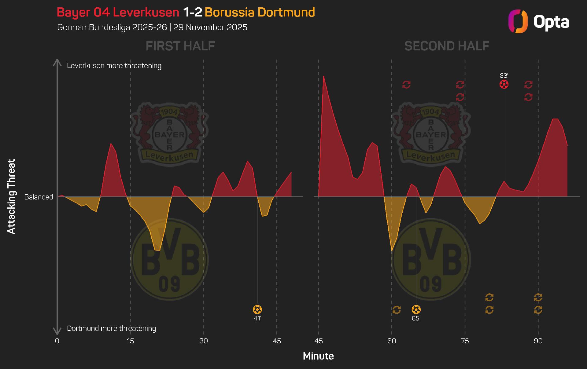 Dortmund only had half as many shots as Leverkusen (seven to 14), though they still won the expected goals (xG) battle, registering 0.99 to their hosts' 0.82.