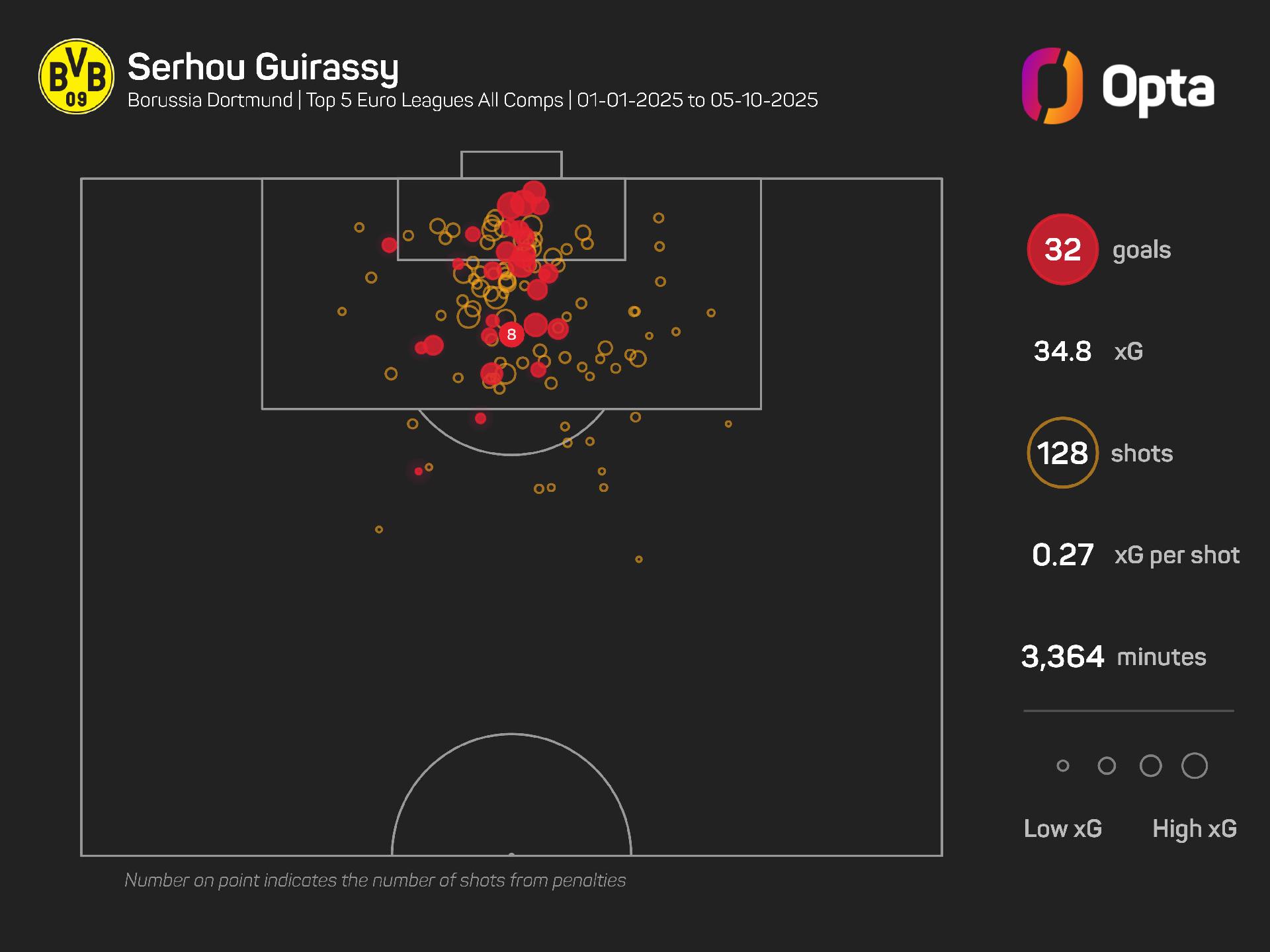 No player has had chances with a greater cumulative expected goals (xG) value than Guirassy (34.82) in that same span, while he has a shot conversion rate of 25% and has averaged a goal every 102 minutes.