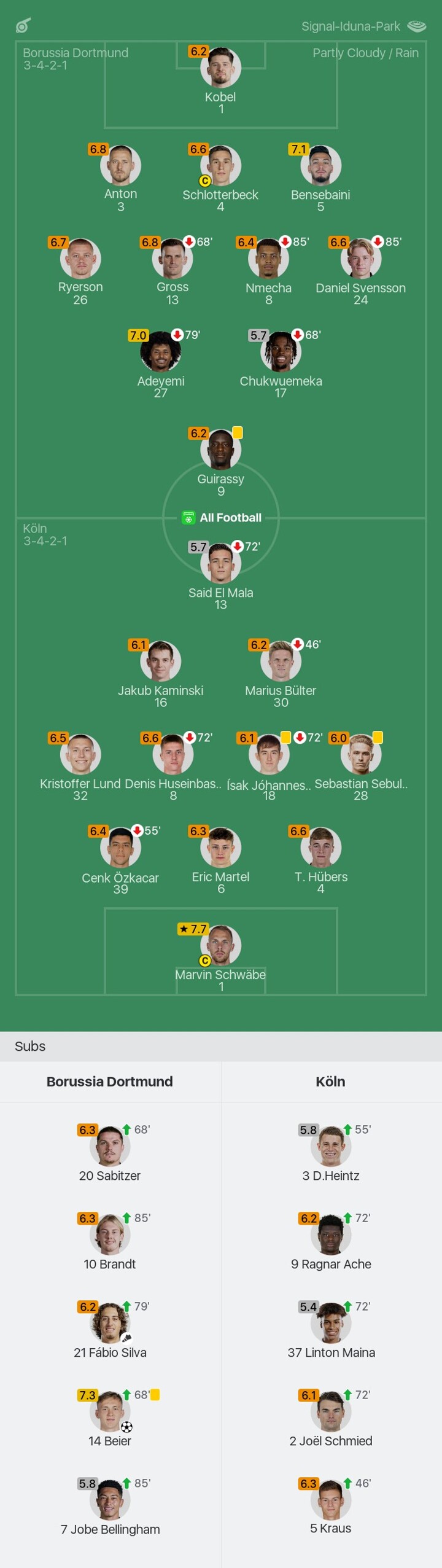 We bring you the player ratings for Borussia Dortmund vs Köln as Marvin Schwäbe becomes Man of the Match with a rating of 7.7.