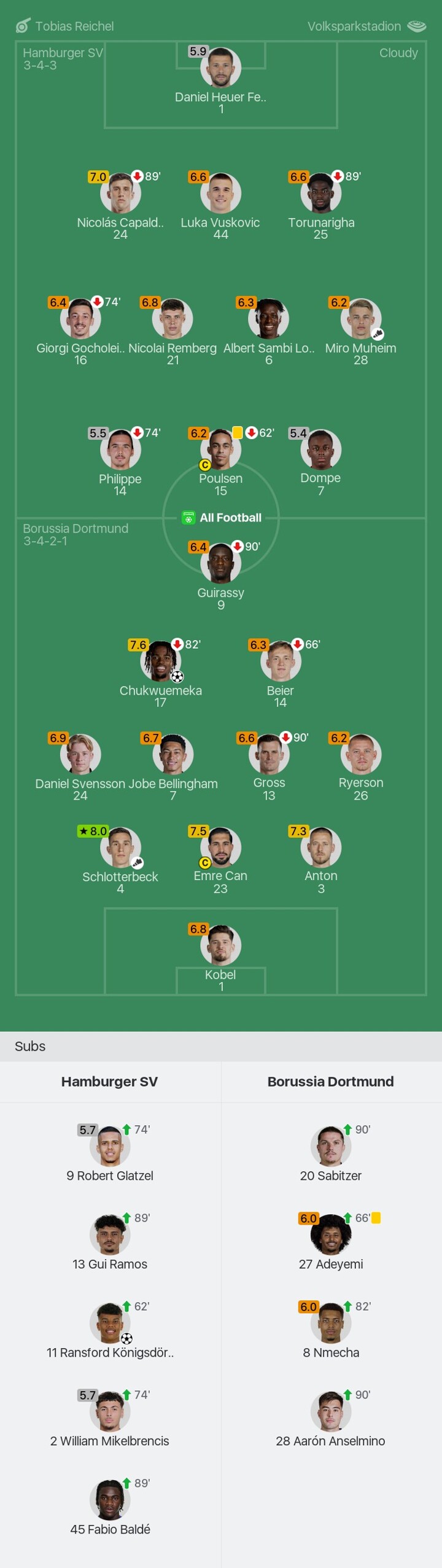 We bring you the player ratings for Hamburger SV vs Borussia Dortmund as Schlotterbeck becomes Man of the Match with a rating of 8.0.