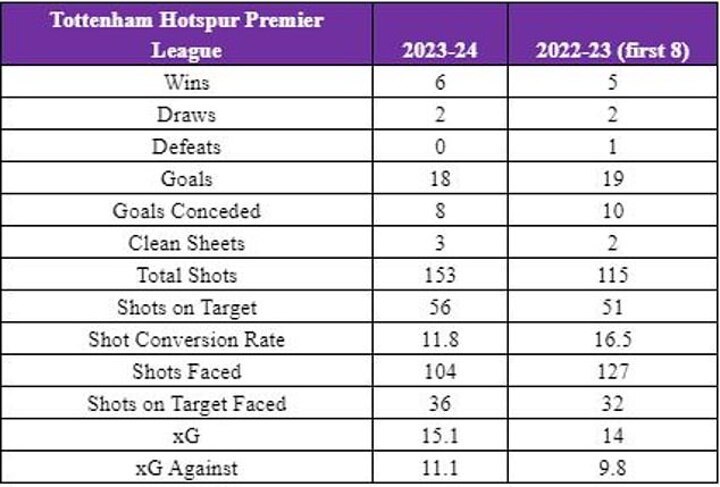 Spurs have had 153 shots in total in their first eight games - 38 more than at the same stage in the 2022-23 campaign, as per stats from Opta.