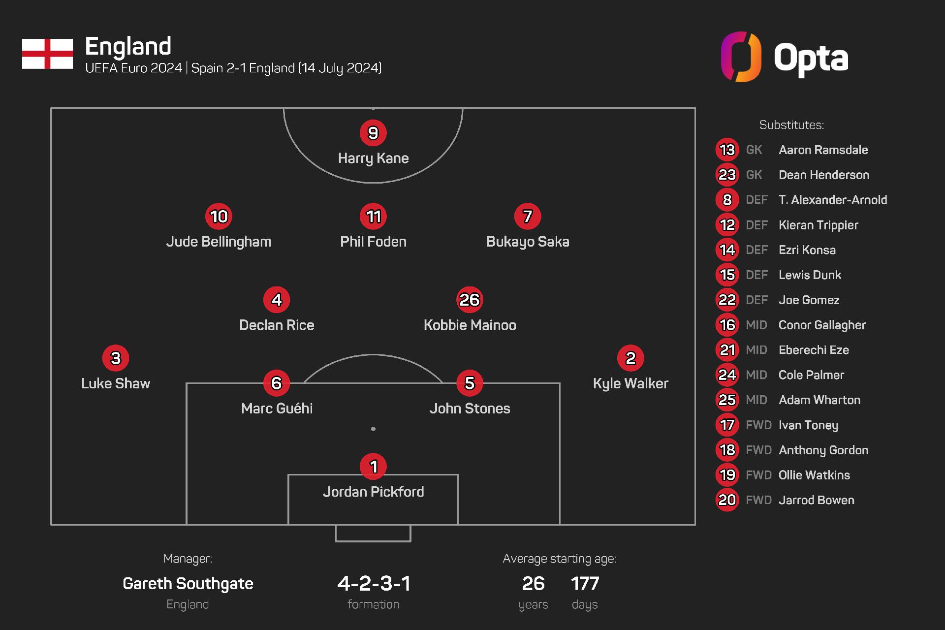 Kane, Bellingham and Foden all started all seven of England's games at Euro 2024, when they reached the final and lost 2-1 to Spain.