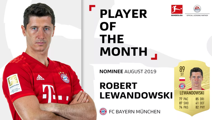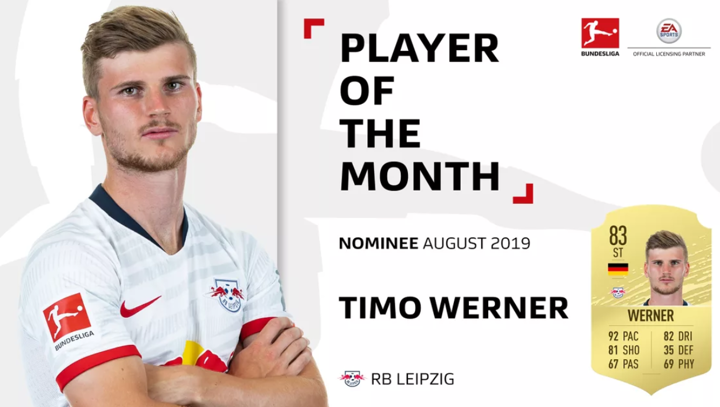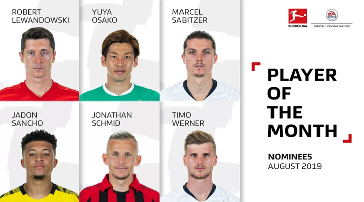 Robert Lewandowski, Yuya Osako, Marcel Sabitzer, Jadon Sancho, Jonathan Schmid and Timo Werner are the nominees for the Bundesliga's August Player of the Month prize. The award, created by the DFL Deutsche Fußball Liga in cooperation with the Bundesliga’s official licensing partner, EA SPORTS FIFA 20, is decided through a two-stage selection process that considers both the players' individual performance data and a vote by fans and experts.