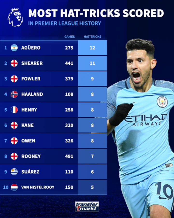 Leading the way is Manchester City legend Sergio Agüero. The Argentine scored 12 Premier League hat-tricks in just 175 games for the Sky Blues, including two four-goal hauls and one five-goal outing against Newcastle in 2015. Second place goes to the division's all-time top goalscorer: Alan Shearer. The Englishman managed 11 hat-tricks in 441 matches. In third is former Liverpool striker Robbie Fowler, who scored nine hat-tricks in 379 Premier League games. Remarkably, in fourth place is already Erling Haaland. The Norwegian has played just 108 matches but has scored eight hat-tricks in the English top-flight.