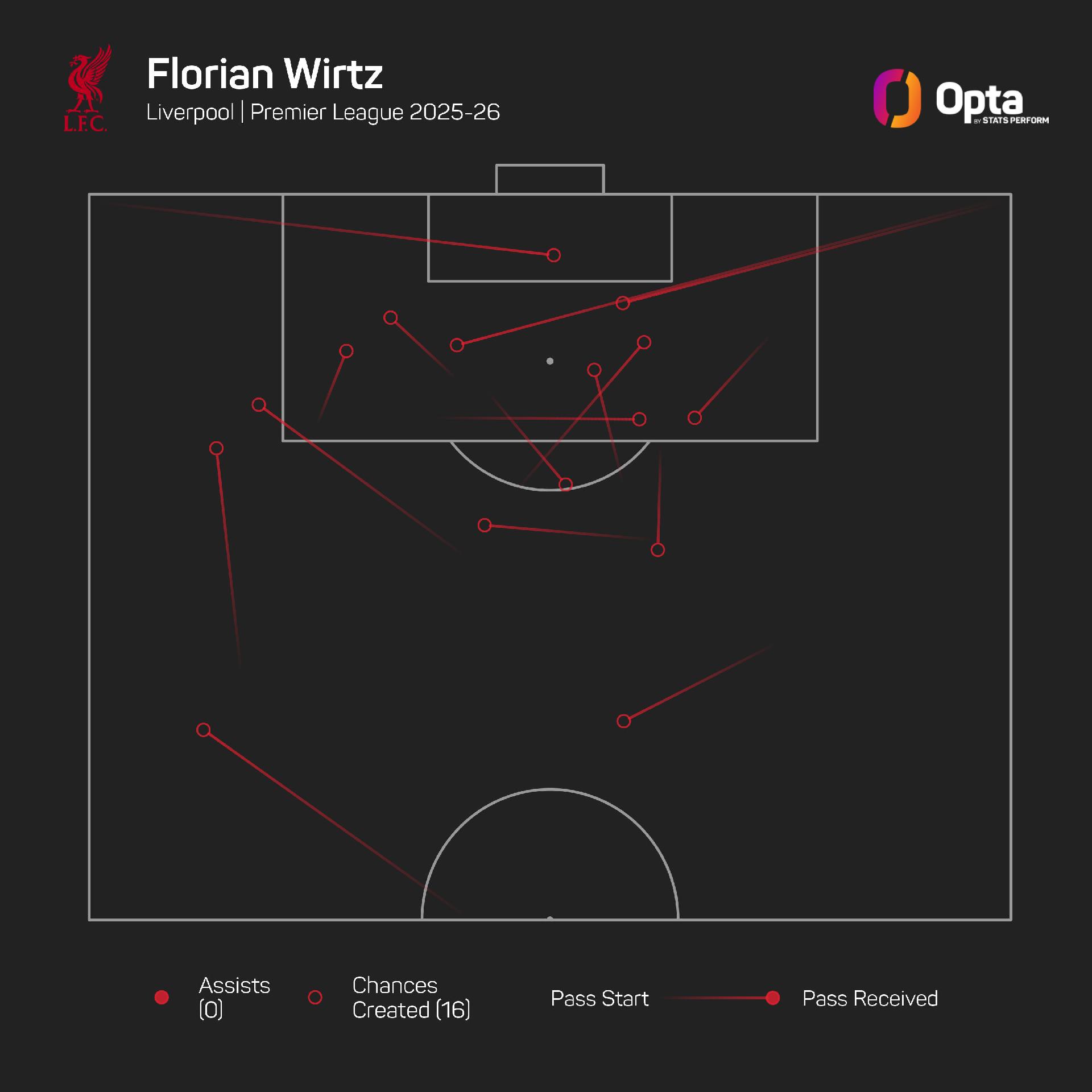 Wirtz has also created 16 chances in the Premier League, a total only bettered by Mohamed Salah and Cody Gakpo (both 21) among Arne Slot's squad in 2025-26.