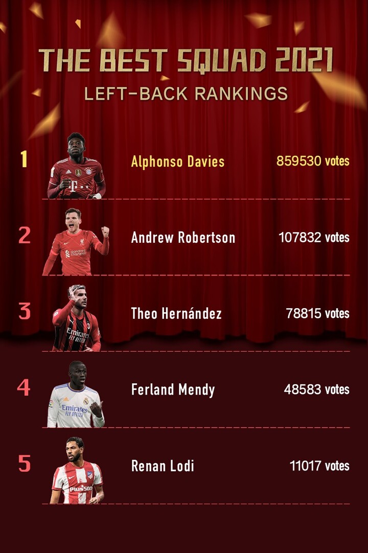 Defenders: Alphonso Davies (Bayern Münich/Canada), Antonio Rüdiger(Chelsea/Germany), Rúben Dias (Manchester City/Portugal), Alexander-Arnold (Liverpool/England)
