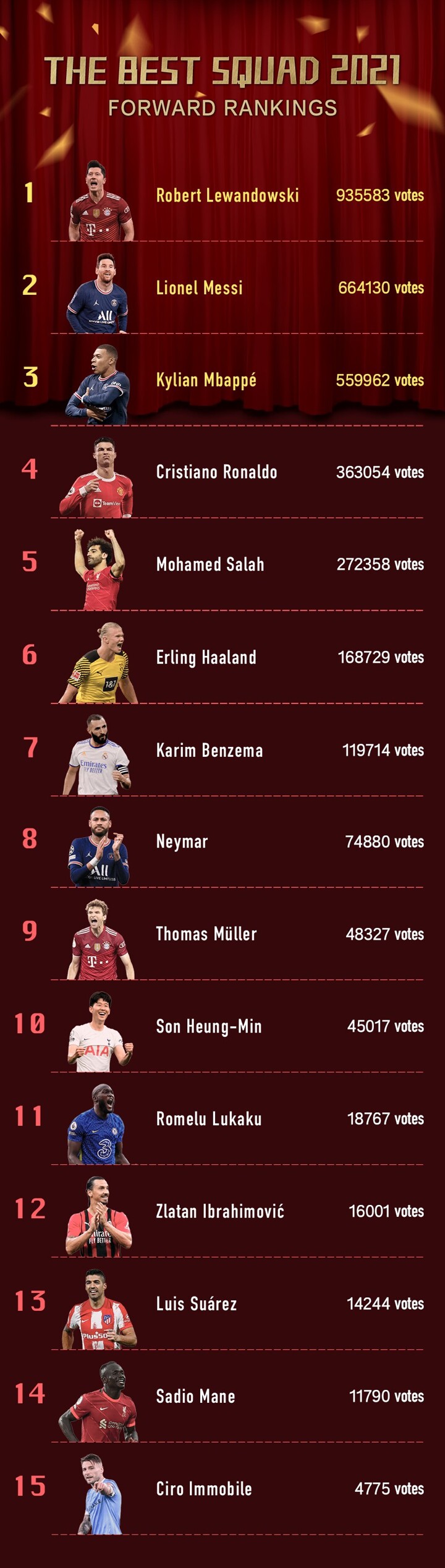 Forwards: Kylian Mbappe (PSG/France), Robert Lewandowski (Bayern Münich/Poland), Lionel Messi (PSG/Argentina)