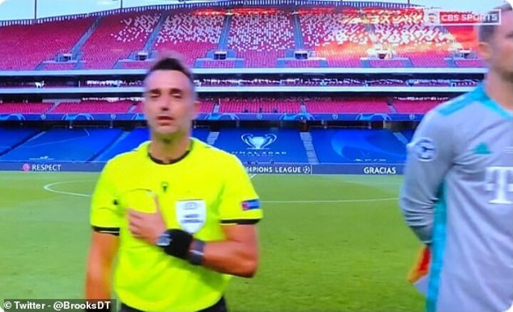 Assistant referee Lorenzo Manganelli, from Italy, has been captured with his hand on his chest as the tune was played before kick off in Lisbon in a rather unusual sight for fans watching the build up.