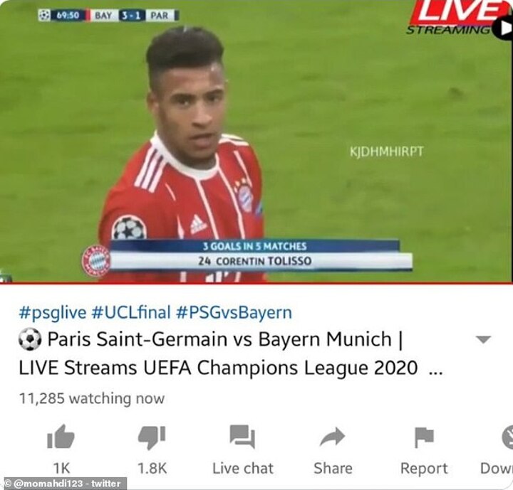 And it would appear that a huge number of football fans were hilariously watching the wrong game on Sunday, with over 11,000 viewing a YouTube stream of Bayern's 3-1 win over PSG in December 2017.