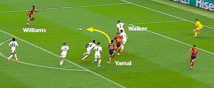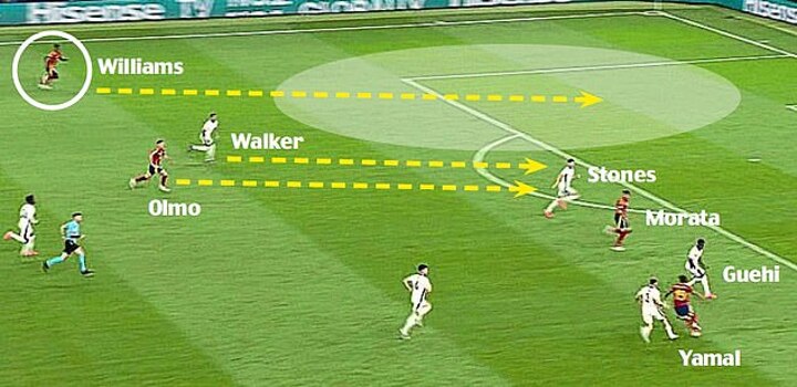 That left Williams all on his own and in space to score after receiving Yamal’s pass, the two wide men combining after coming inside.