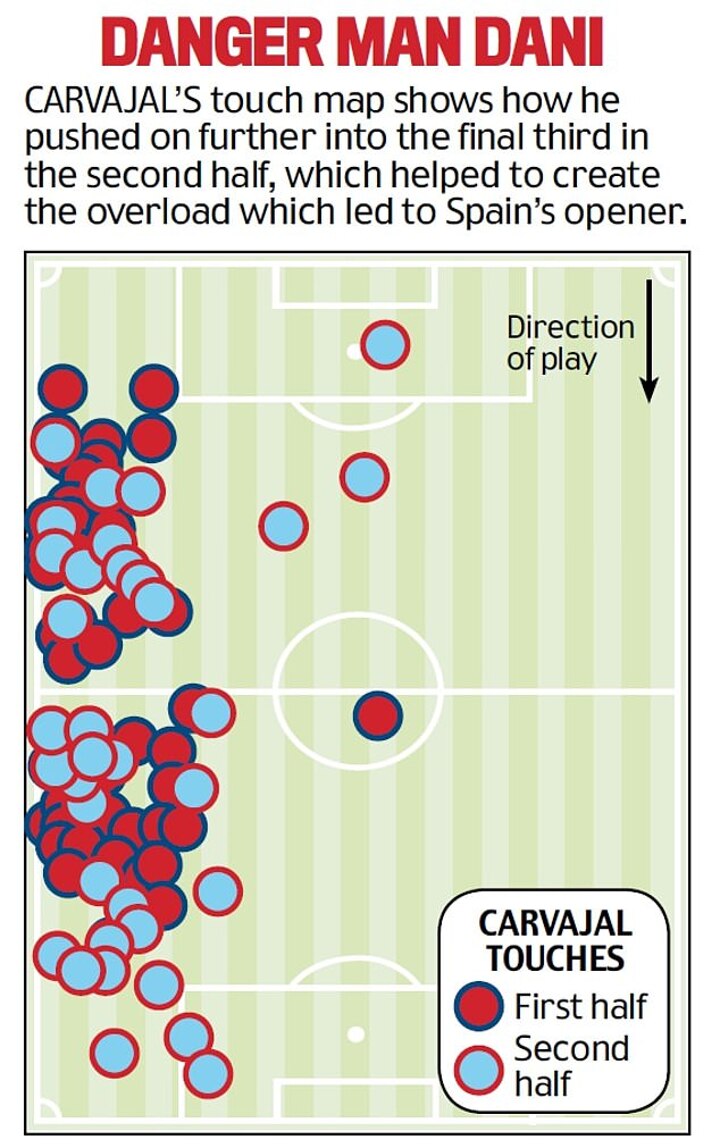 He threw the ball all the way down the touchline to Stones, who passed back to Pickford, who kicked long and out for a Spanish goal-kick. It was wasteful from England and an indication that unlike Spain, we lacked a plan for how to penetrate our opponents.