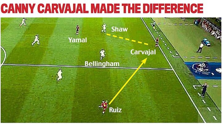 Yet the move for Spain’s opener started with Bellingham failing to follow Carvajal after he flew down the flank. That left Shaw unsure whether to close down Carvajal or staying tight with Yamal.
