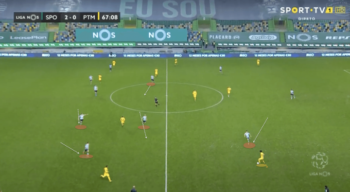 Similarly, any of the wide forwards can drop in to pick up the pivot, and allow Sporting’s own central-midfielders to remain in position.