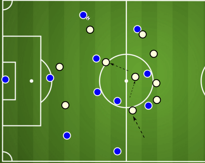 Whilst their wing-backs will press the wide areas, they stay deep and compact until that pass is played. The aggressive press of their front three, and mobility of the double pivot pushes the opponent to play long, or play wide. If it goes wide, we have seen how they shut off any passing options, and if they go long this five have the upper hand.