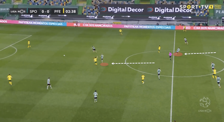 Unless the opponent have a player floating beyond Sporting’s first line of press, there’s no need to play with anyone in this space, and Sporting will happily play with a very reserved shape behind this front three.
