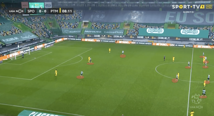 As we can see in this image, the front three man-mark the opposition back three and therefore, force the opposition to play long. With the opponent having two wide players hugging each touchline, Sporting have a 7 v 5 overload in the centre of the pitch on the halfway line, and have the upper hand in the aerial duel and on the immediate loose ball duel afterwards.