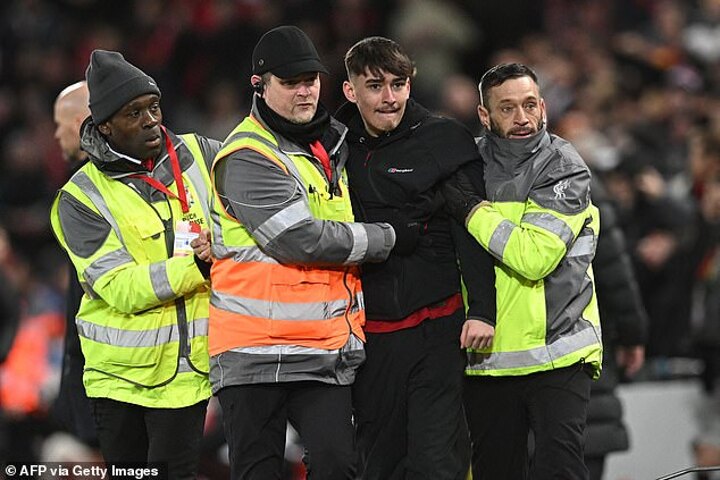 The supporter, who stormed the pitch at Anfield after Firmino netted in the 88th minute, slipped as he approached the players and wiped out Robertson, who fell to the ground and held his ankle in some pain.
