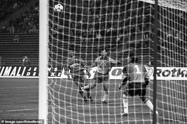 Ian Crook started it with a typically polished free-kick clipped towards the Bayern Munich penalty spot. There, 6ft 3in Chris Sutton, 20, jumped for the cross as 5ft 9in Lothar Matthaus, 32, looked on.