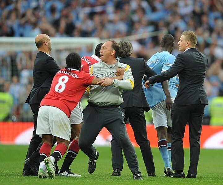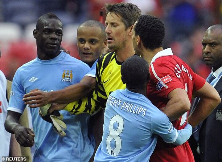 As the final whistle confirmed City's passage to a first FA Cup final since 1981, simmering tempers flared. Ferdinand and Anderson were infuriated as Balotelli gloated by thrusting the badge on his shirt in the direction of the United fans.