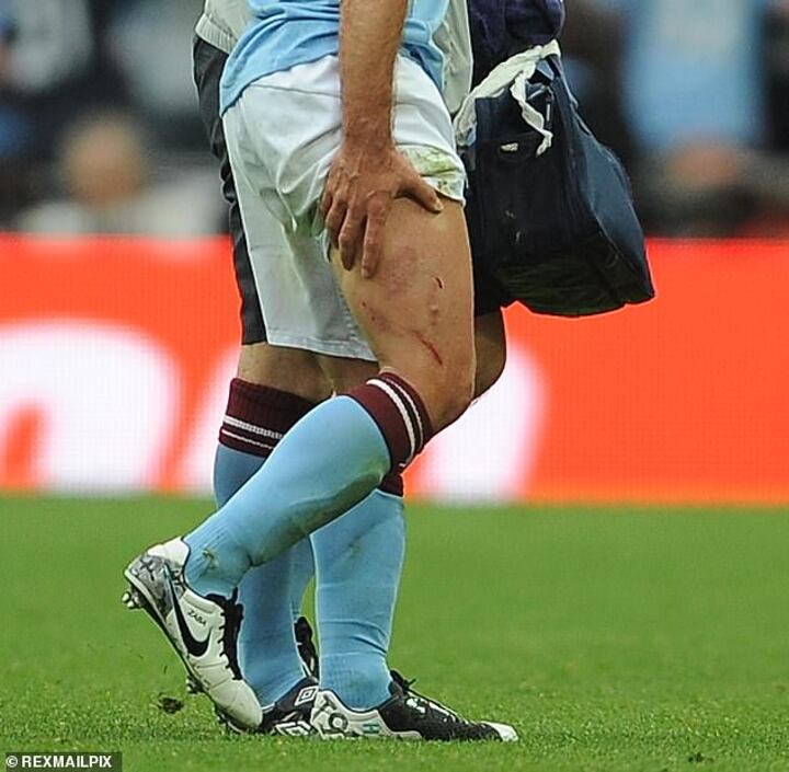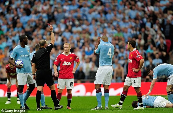 Scholes went in studs-first, over a bouncing ball, and planted them into Zabaleta's thigh, drawing blood. Referee Mike Dean really had no alternative.