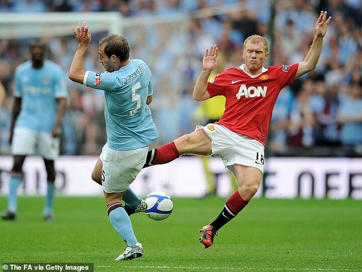 But United's hope was killed off 17 minutes from time when Scholes - in that classic Scholes manner - went full throttle into a 50-50 with Zabaleta near the halfway line.