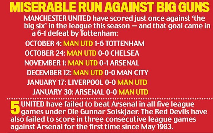 In six games against Arsenal (who they have now played twice), Chelsea, Tottenham, Manchester City and Liverpool, United have scored one goal (a penalty) and failed to win.
