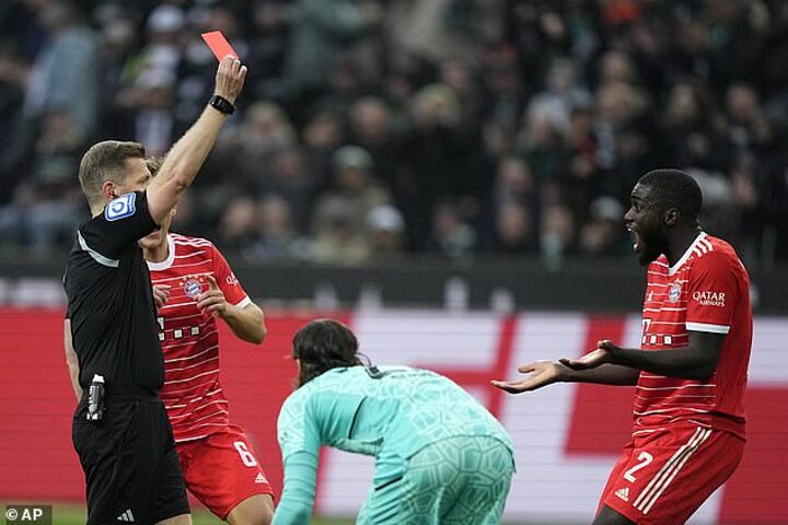 Gladbach went ahead through Stindl in the 13th minute after Bayern got off to a nightmare start with Dayot Upamecano bringing down Alassane Plea outside the box and being sent off for his last-man foul in the eighth minute.