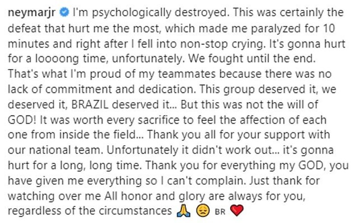 'I'm psychologically destroyed', Neymar began. 'This was certainly the defeat that hurt me the most, which made me paralyzed for 10 minutes and right after I fell into non-stop crying.