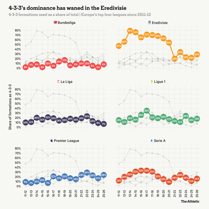 His successor, Arne Slot, adjusted the shape to a 4-2-3-1, despite being schooled in the Dutch 4-3-3 traditions. The shift reflects how Dutch football has become more tactically diverse, moving away from what Cruyff called “the house style”. As shown in the graphic below, the 4-3-3 accounted for just 29 per cent of formations used in the Eredivisie last season, down from a peak of 79 per cent in 2013-14.