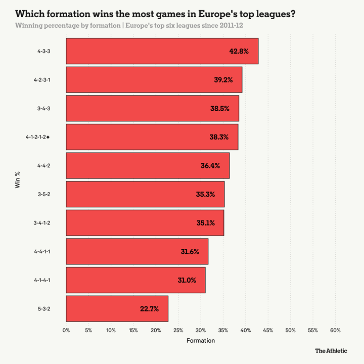 Cruyff was steadfast in the formation’s primacy. “Anyone with the guts to use 4-3-3 in the right way will be rewarded in the end as long as the right players are chosen for the system,” he wrote in My Turn. On a surface reading, the 4-3-3 appears to be football’s most successful formula: since 2011-12, teams using it have won 42.8 per cent of their matches — the highest share among the ten most common formations.