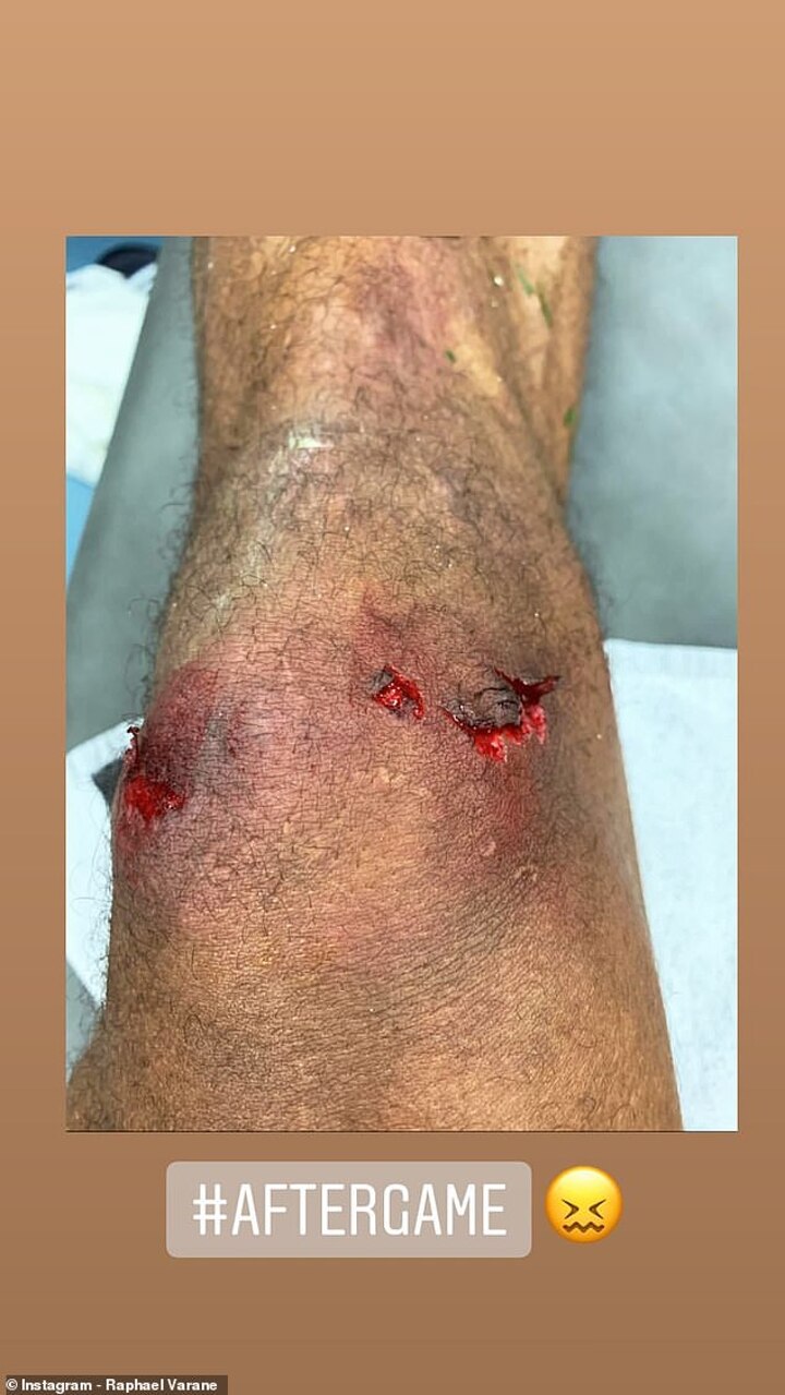 The evidence of the goalmouth scramble can be seen in Varane's Instagram post that shows his knee covered in cuts and bruises.