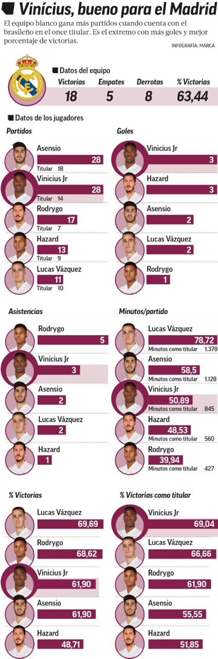 There is no doubt that at the age of 20, Vinicius still has a lot to improve and that he still hasn't quite hit the heights at Real Madrid just yet. There are people at the club who are convinced the best is yet to come, though, and when you're the forward who has the best win rate at the club, you must be doing something right.