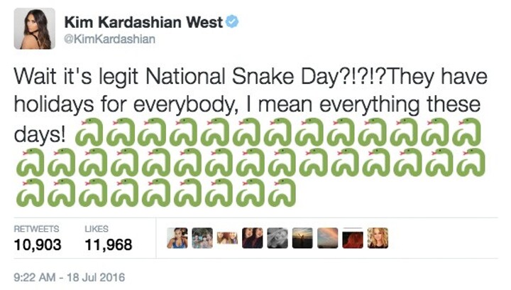 Kim Kardashian is a known user of the snake emoji – and its connotations. In a carefully disguised subtweet in summer 2016, Kardashian accused Taylor Swift of being a 'snake' and called her out on 'national snake day'. The snake emoji was used in the aftermath of a feud involving Swift and Kanye West, with the 'You Belong With Me' singer having been accused of lying and betrayal.