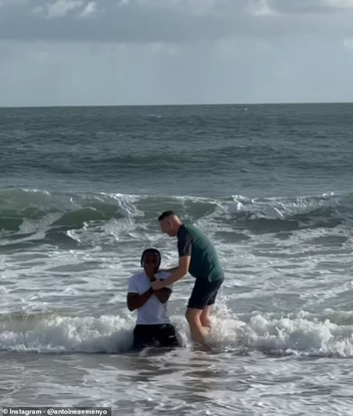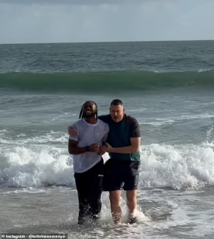 Wearing a white shirt and black trousers, Semenyo submerges beneath the water as the waves crash towards the shore. After rising to his feet, he then looks to the heavens with a huge smile on his face.