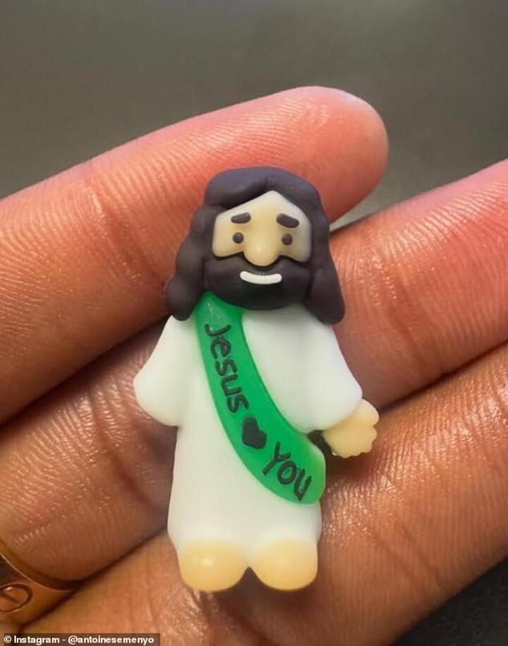 The 25-year-old's Instagram profile reads that he is 'powered by Jesus' and, in his latest series of images, he can be seen holding a figurine of Christ wearing a green sash emblazoned with the words 'Jesus [loves] you'.