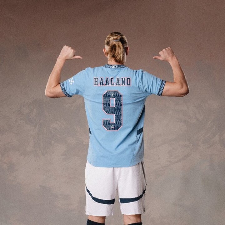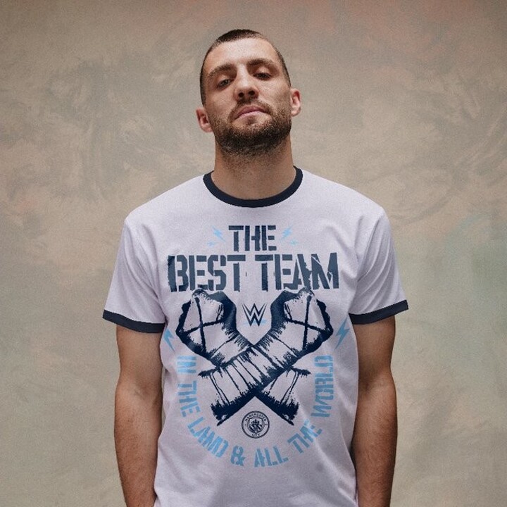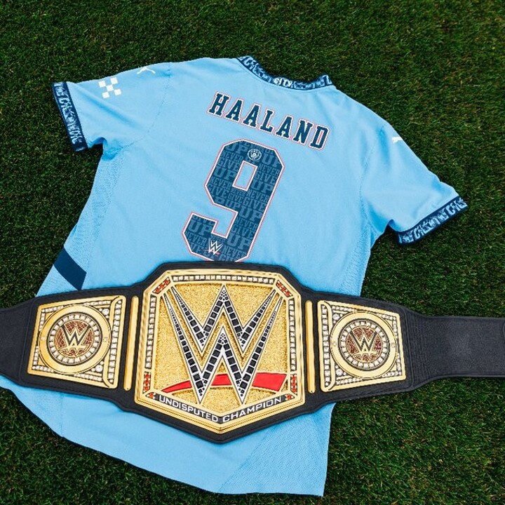 梦幻联动,曼城官方携手WWE推出专属球衣印号字体、T恤系列。