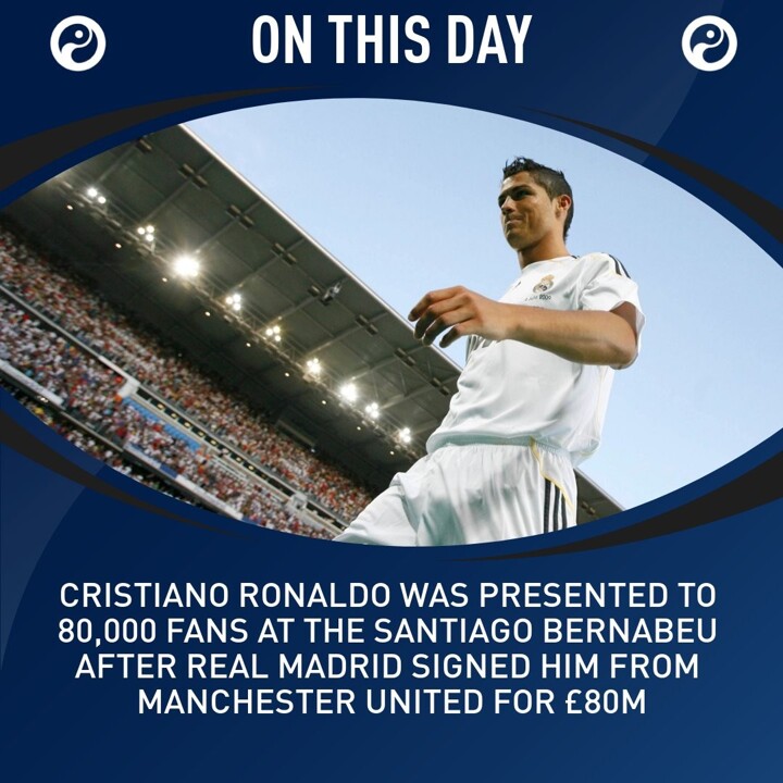 On this day in 2009, Cristiano Ronaldo was presented to a record-breaking 80,000 fans at the Santiago Bernabéu after signing for Real Madrid for £80m.