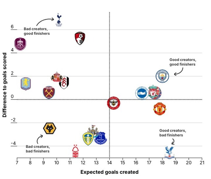 Spurs supporters yearn for the attacking freedom of the Postecoglou era, though he was dismissed for defensive frailties. Frank was hailed as a successor capable of balancing attack and defence, renowned for tactical acumen and player development. Yet present-day Tottenham appear ensnared in identical predicaments, this time without former chairman Daniel Levy. How the new management will navigate this remains unclear. The statistics also paint an unfavourable picture for Frank. Tottenham have scored seven more goals than expected this season, making them one of the Premier League's most overperforming teams. This indicates limited chance creation, relying instead on clinical finishing to prop up their tally. Despite the club injecting £100 million in October, their spending remains far below that of the top elite clubs.
