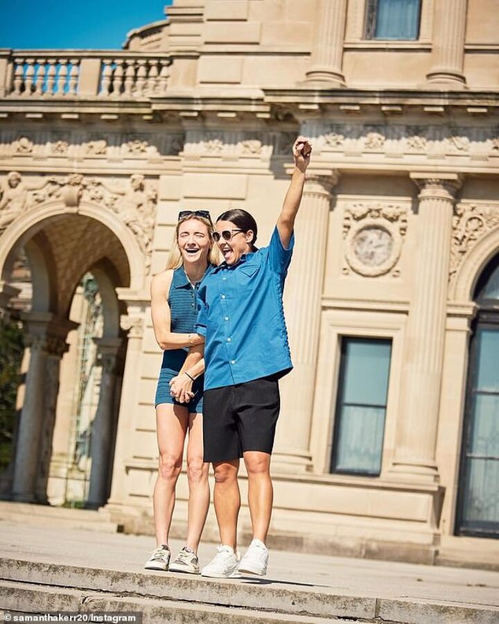 The Matildas striker included the shot in an Instagram post accompanied by the simple caption 'September people x' with two other images showing a jeweled ring on the left ring finger of her girlfriend Mewis.