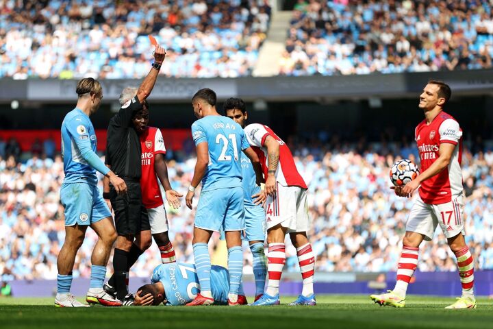Arsenal are the club with the joint-most red cards in the 2021-22 season. The Gunners have had four players sent off this campaign. Two of Arsenal's sending-offs have come in both fixtures against Manchester City.