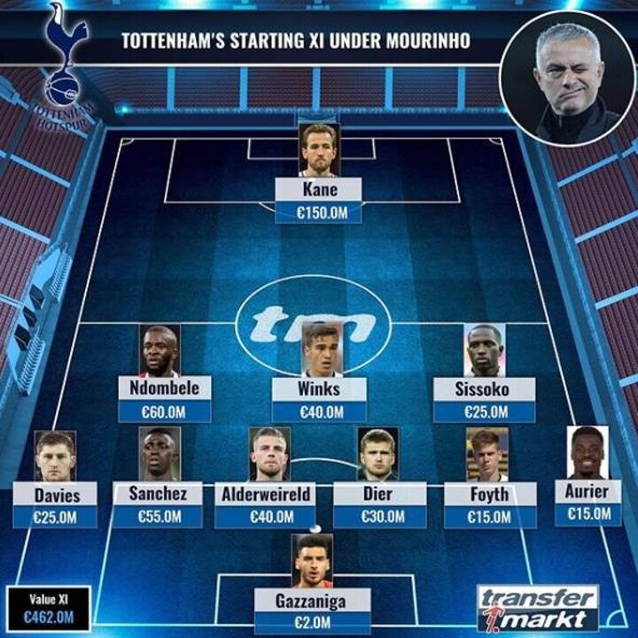 Transfermarkt makes an XI for Mourinho's Spurs as it is expected that the new manager will form a 6-3-1 formation as only Harry Kane is at the front as a striker while most of the players are in the back defending.