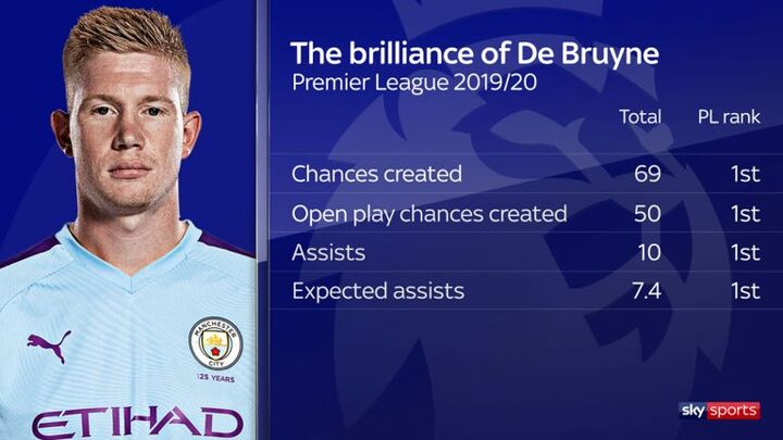 His assist on Saturday night, which he celebrated gleefully in front of the Manchester City fans behind Kasper Schmeichel's goal, was his 10th of the campaign. It is three more than any other player in the division. De Bruyne also ranks top for chances created, chances created from open play and even expected assists, which measures the quality of those chances.