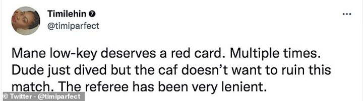 'Mane low-key deserves a red card,' they said. 'Multiple times. Dude just dived but the caf doesn’t want to ruin this match. The referee has been very lenient.'