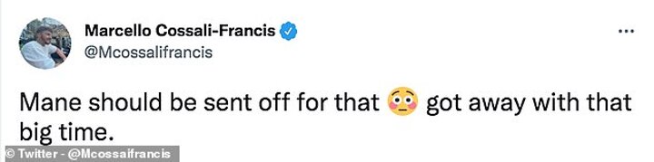 While another, Marcello Cossali-Francis, added: 'Mane should be sent off for that. Got away with that big time.'